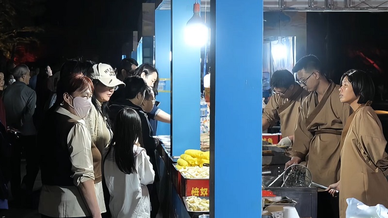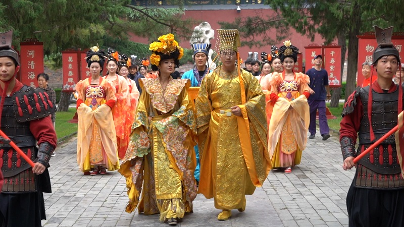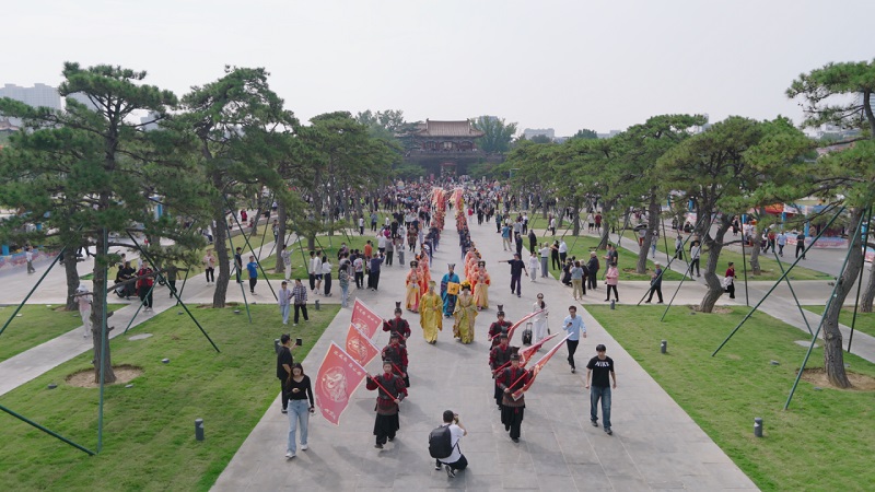 本次文化旅游節(jié)活動(dòng)自10月1日持續(xù)至10月5日,活動(dòng)期間設(shè)置了主題鮮明、層次豐富的特色內(nèi)容。每日10時(shí),來自中華泰山·封禪大典的演藝團(tuán)隊(duì)以《萬國來朝·盛世啟市》主題演出拉開序幕。天鼓初鳴之際,悠遠(yuǎn)號角與鏗鏘鼓點(diǎn)交織共鳴,依次呈現(xiàn)開場迎賓禮、司禮官肅穆登場、舞姬書生伴唐宮人物(李治、武則天)盛裝巡游。巡游結(jié)束后,演員們將化身隱藏NPC,身著唐宮華服扮演“帝王”“貴妃”等角色,與游客展開對詩猜謎、合影互動(dòng)等環(huán)節(jié)
